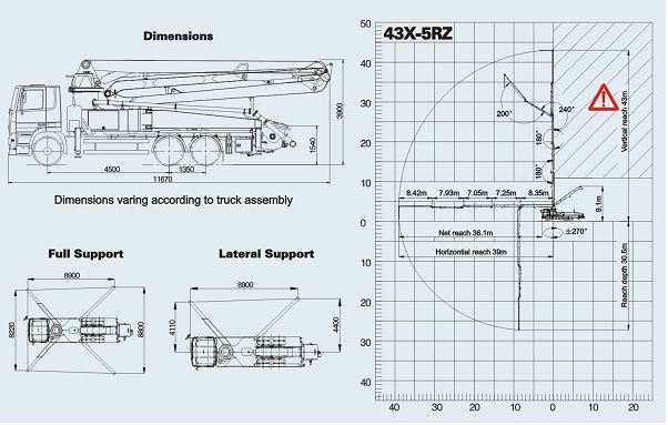Структура башни и стрелы обладает высокой прочностью, что обеспечивает работу на широком диапазоне строительных площадок и многообразие в использовании. Образование трещин снижено до минимального уровня. Благодаря особому процессу сварки высокопрочной стали достигается не только увеличение срока службы стрелы, но также гарантируется стабильность всей системы в целом. Используемые шасси изготовлены компаниями MERCEDES, ISUZU и SCANIA. Бетононасосы оснащены современным двигателями, соответствующим стандартам Euro 4 по выбросу газов в атмосферу. Гидравлическая система с закрытым контуром поставляется с мощным поршневым насосом, обеспечивающим высокое давление.